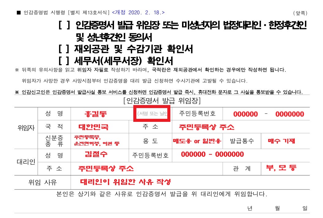 인감증명서 대리발급 받을 경우, 위임자가 자필로 위임장을 작성해야 합니다.